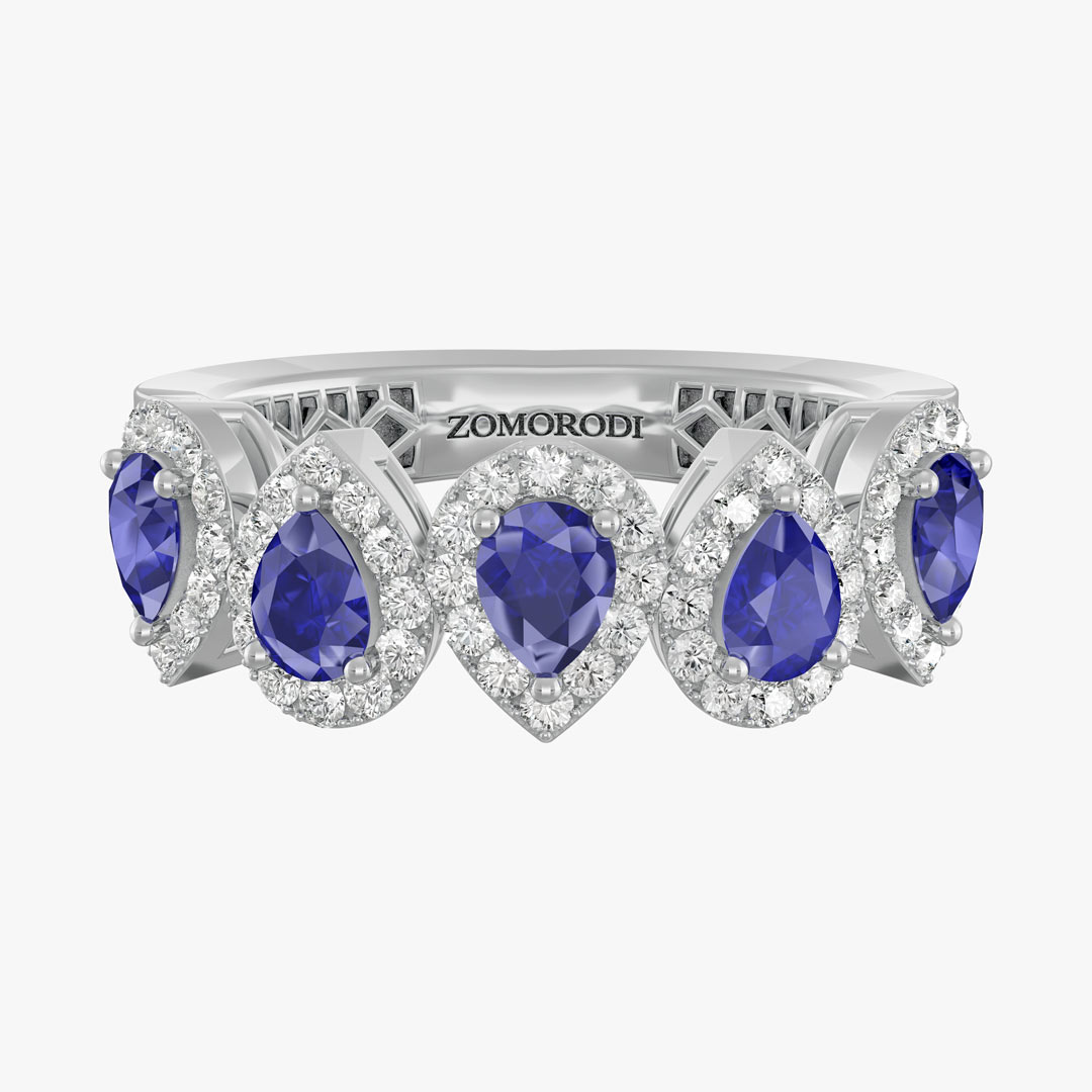 روی این انگشتر جواهر 5 تخمه یاقوت کبود با تراش اشک میان 60 عدد برلیان قرار دارند.